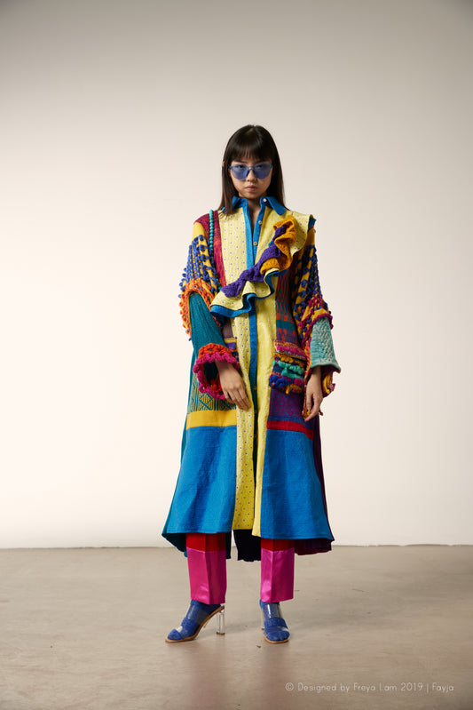 Show outfit 1 - Jacquard Jacket with chunky hand crochet bag and neck trims